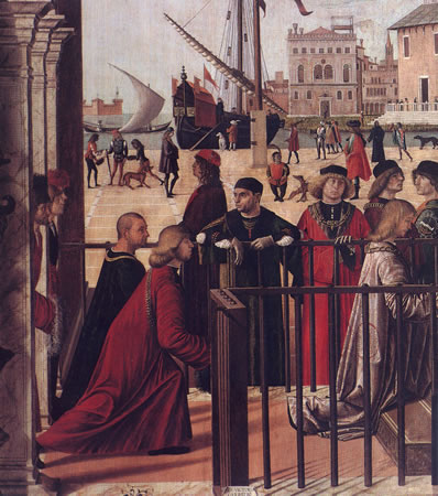 In the cycle of canvas paintings by the Scuola Grande di San Giovanni Evangelista we see an illustration of De Commynes’ words: a picturesque and teeming humanity invades Venice. The authors of these works are Carpaccio , Gentile Bellini , Bastiani, Diana and Mansueti.Gondola. A lazy white dog on another gondola watches the spectacle with a surprised expression. On the banks are gentlemen, representatives of the middle class and members of the Compagnia della Calza, an association of young people dedicated to fun and culture. This vision of the city is reflected in the diaries of Marin Sanudo, a young educated Humanist, and the map by De Barbari dated 1500.