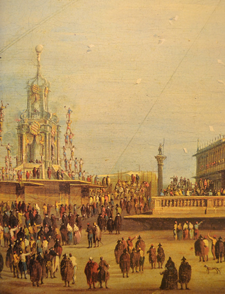 A fine Canaletto's painting shows us the Doge between two crowds of people in Campo San Rocco, standing under a large tent specially set up for the occasion.